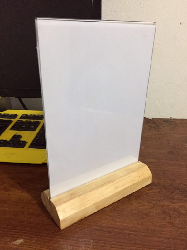 Menu mica đế gỗ được kết hợp giữa phần đế được làm bằng gỗ thông. Mặt trên được làm bằng mica tạo ra điểm nhấn mạnh trong quá trình quảng cáo, tiếp thị thông tin sản phẩm